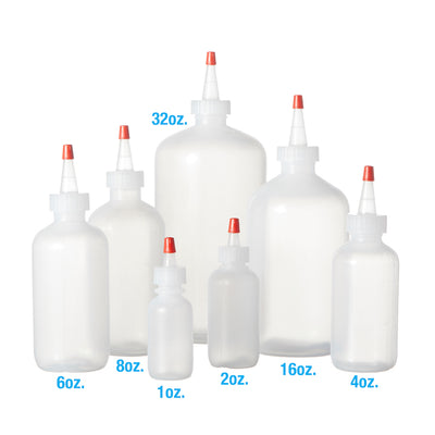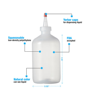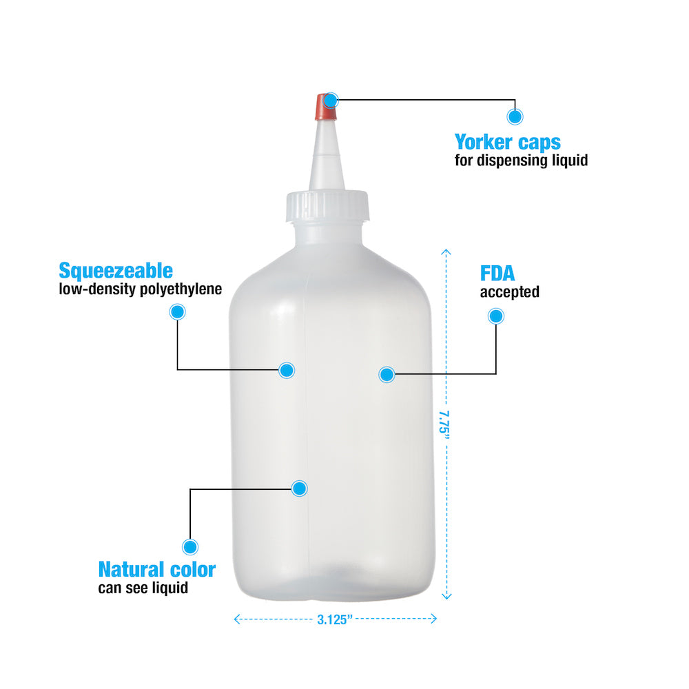 Boston-Round plastic squeeze bottles are excellent for storing and dispensing a wide variety of products. Color is natural. Yorker dispensing cap included. FDA accepted. Orifice size is .030 in. Height includes cap.
