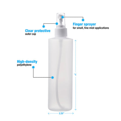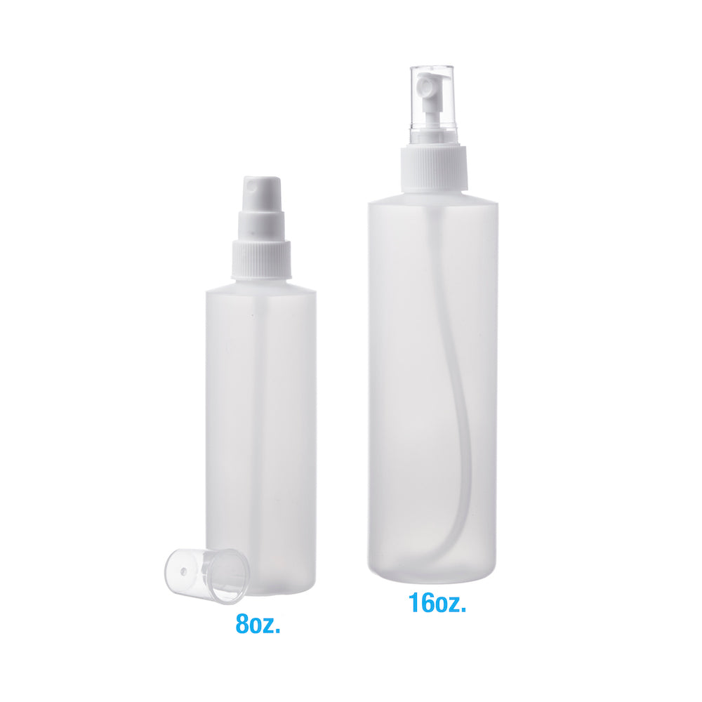 Choose these pump finger sprayers for small, fine mist applications. Clear, protective outer cap included with each fine mist pump sprayer. Bottles and sprayers are high density polyethylene. The 8 oz bottle comes with a 24mm sprayer and the 16 oz bottle comes with a 28mm sprayer.