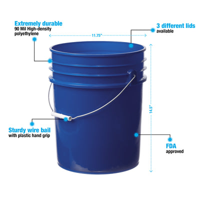 These 5 gallon HDPE buckets are extremely tough. 90 MIL construction allow for these buckets to be used over and over again. Sturdy wire bail with a plastic handgrip is attached to these 5 gallon pails. Meets FDA standards. Buckets & lids sold separately.