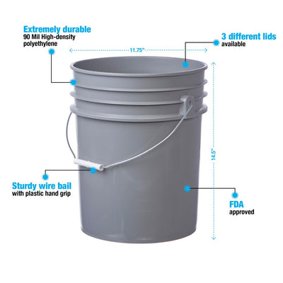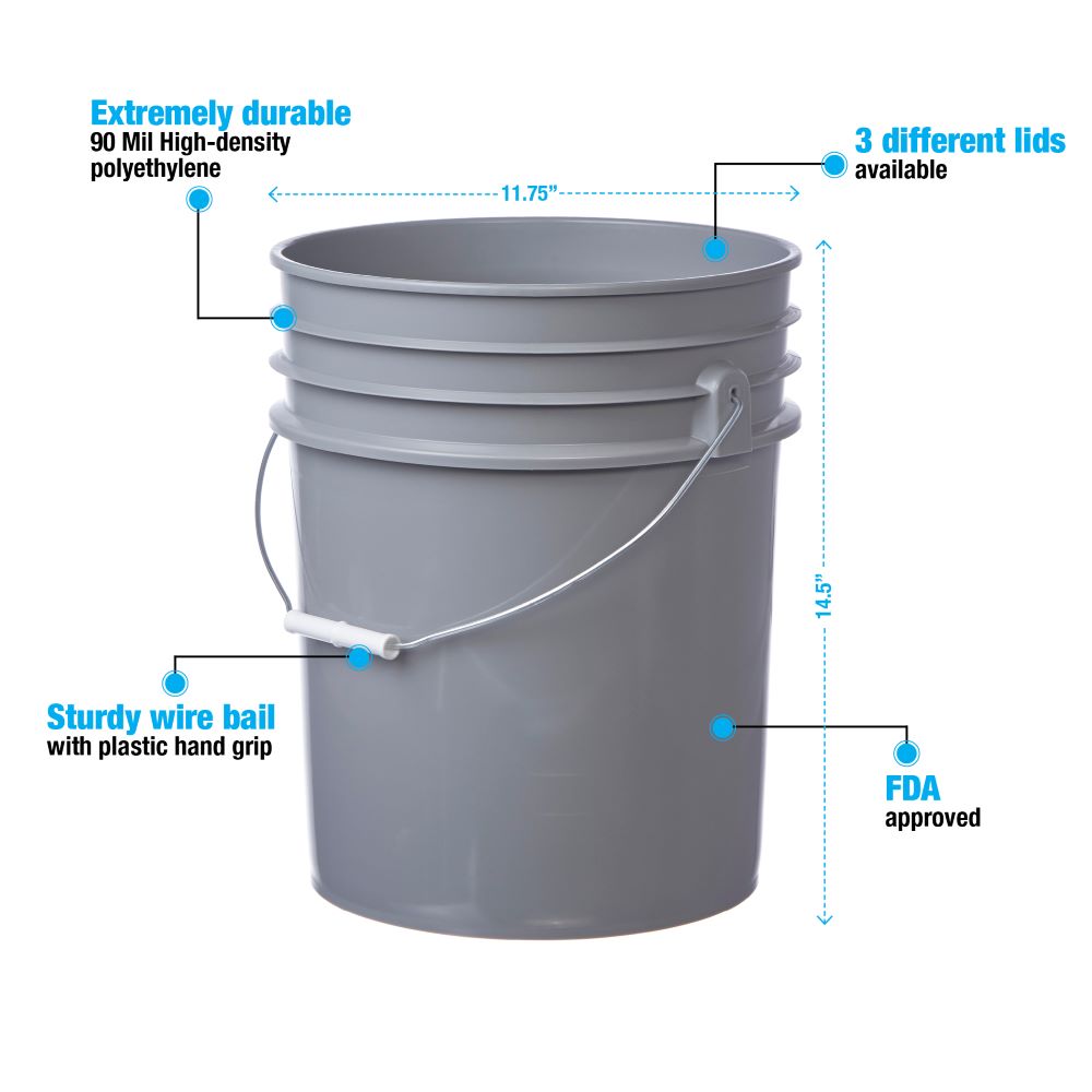 These 5 gallon HDPE buckets are extremely tough. 90 MIL construction allow for these buckets to be used over and over again. Sturdy wire bail with a plastic handgrip is attached to these 5 gallon pails. Meets FDA standards. Buckets & lids sold separately.