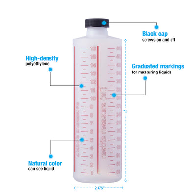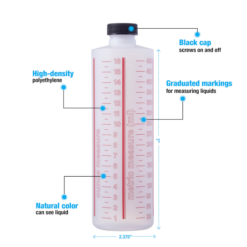 Plastic cylinder-round bottles with caps are excellent for use in storing, transporting, and packaging a wide variety of products. Our 16-Oz. measure bottle is available for quick and easy measuring of products. Black cap included.