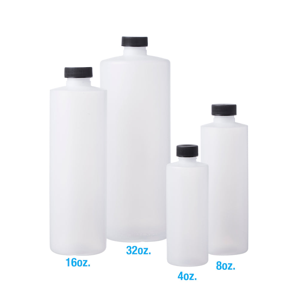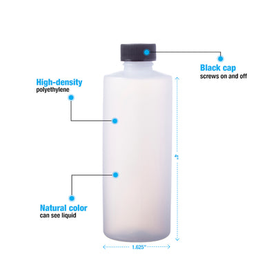 Plastic cylinder-round bottles with caps are excellent for use in storing, transporting, and packaging a wide variety of products. Our 16-Oz. measure bottle is available for quick and easy measuring of products. Black cap included.