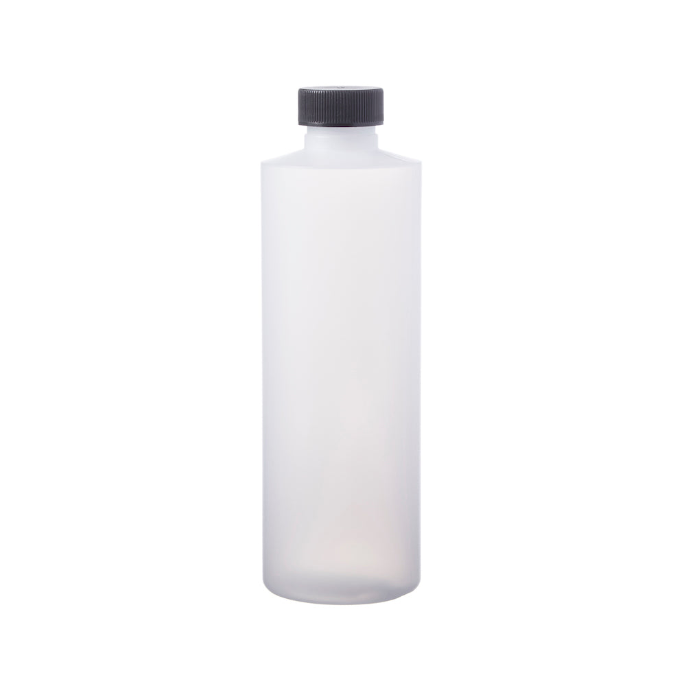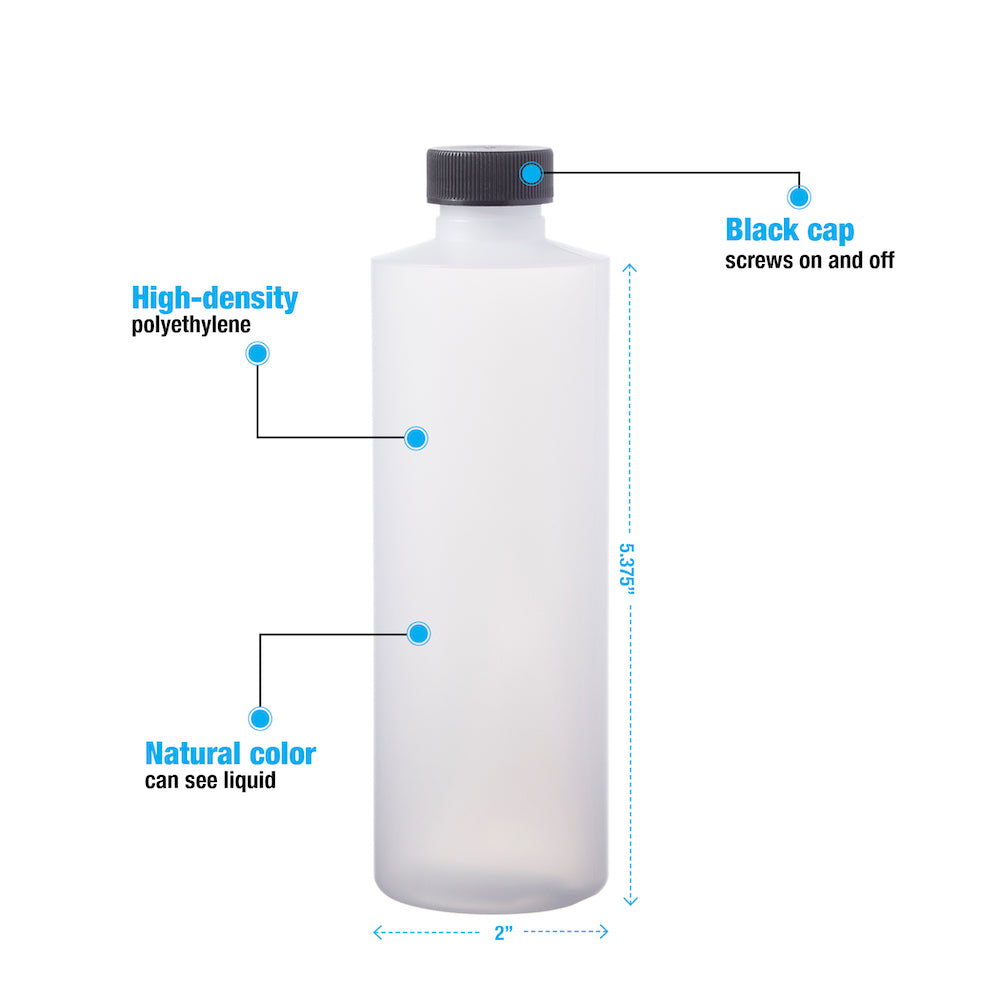 Plastic cylinder-round bottles with caps are excellent for use in storing, transporting, and packaging a wide variety of products. Our 16-Oz. measure bottle is available for quick and easy measuring of products. Black cap included.