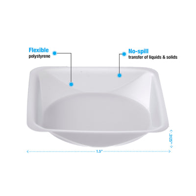 These weighing dishes are made of flexible polystyrene for handling liquids or solids during weighing. Dishes bend easily for pouring to ensure no-spill transfer after weighing and stack neatly for storage.